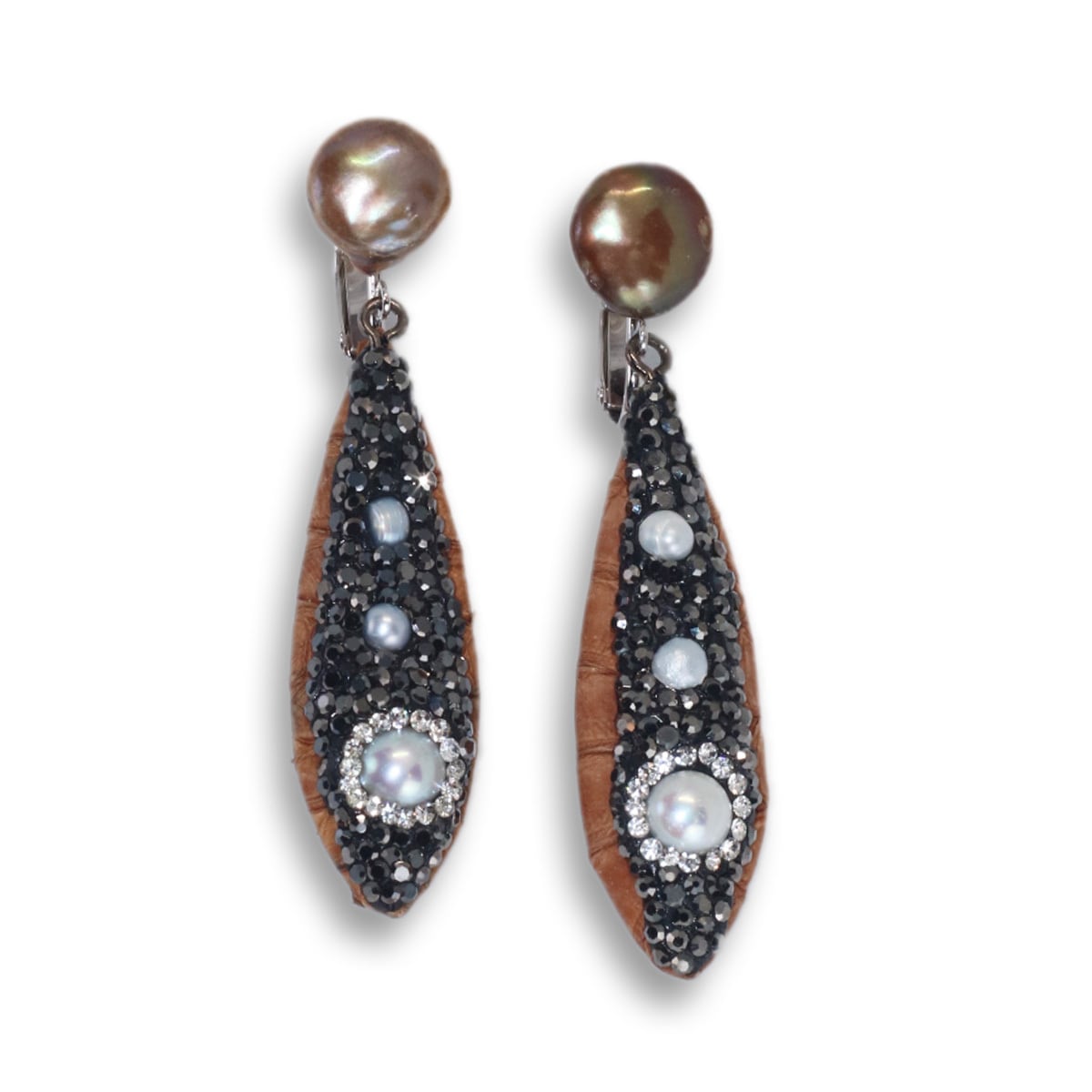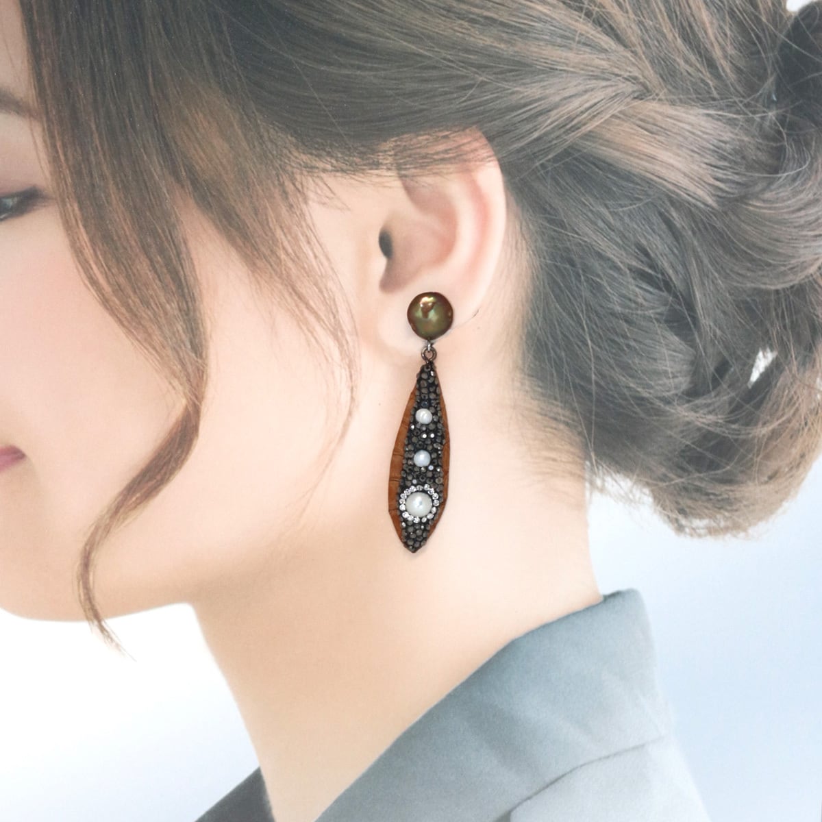 在庫限り! 細長フォルムで 小顔効果が狙える ブラウン 淡水パール インパクト イヤリング mm1016