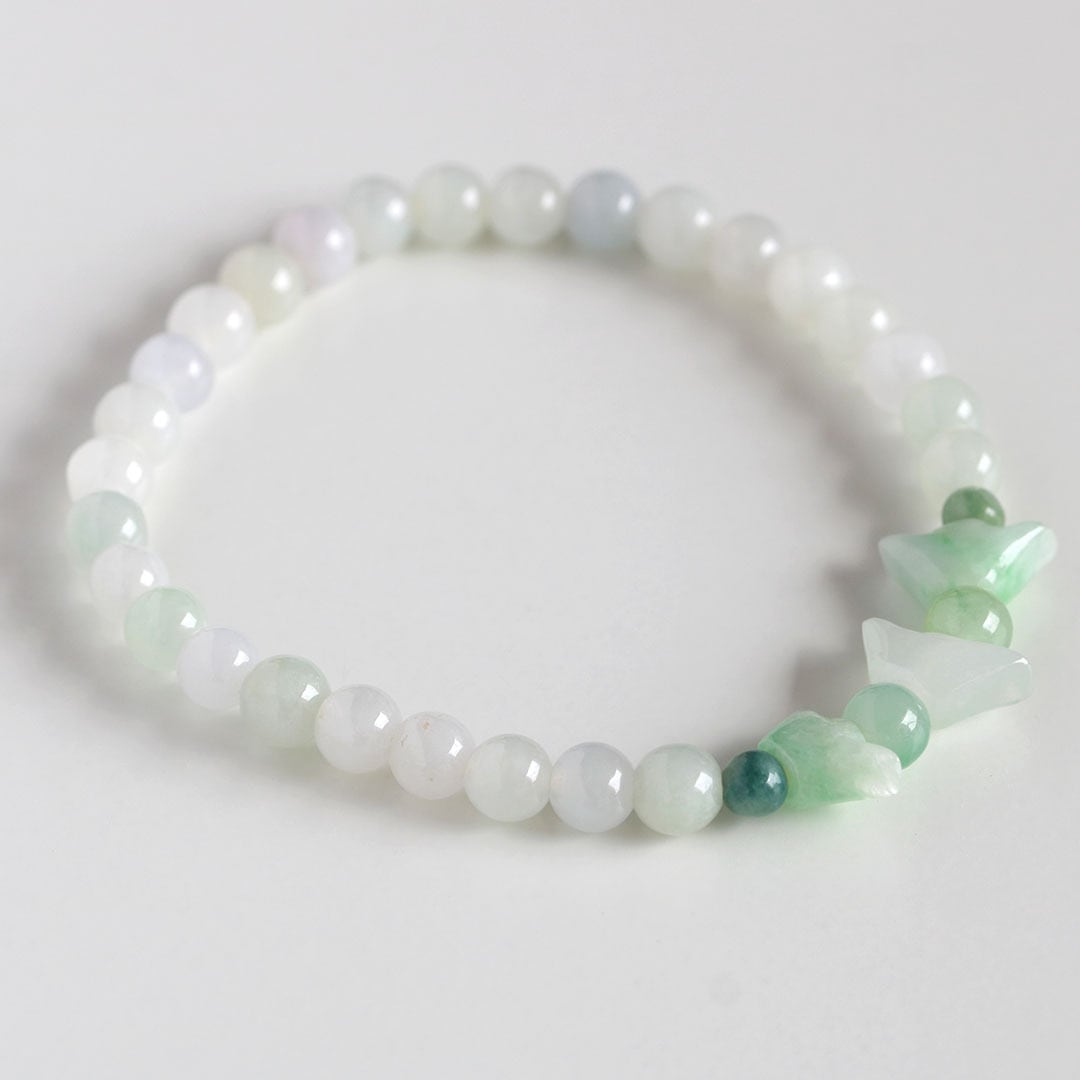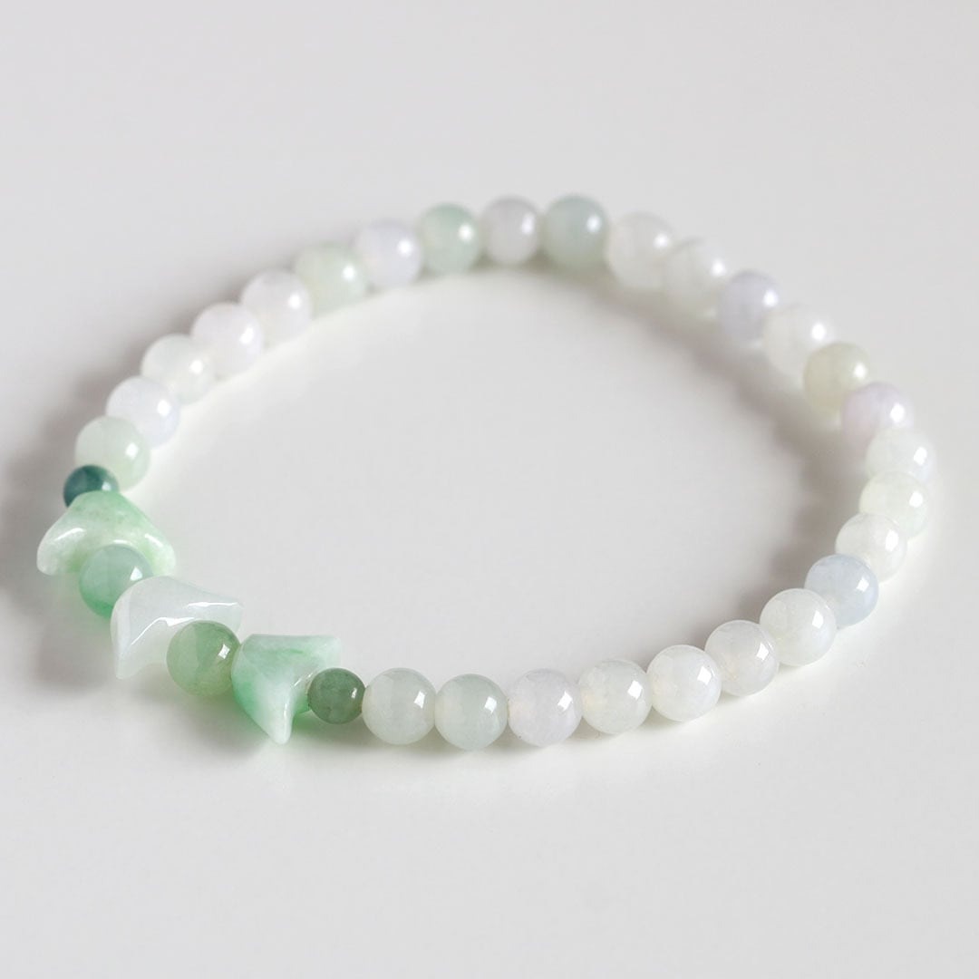 プルンとした白翡翠に銀子3粒をあしらったつけやすいブレスレットのご紹介です。