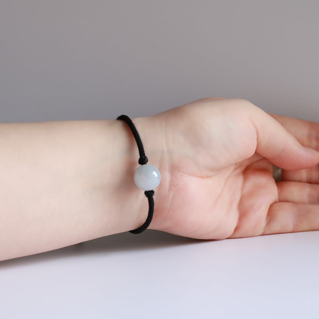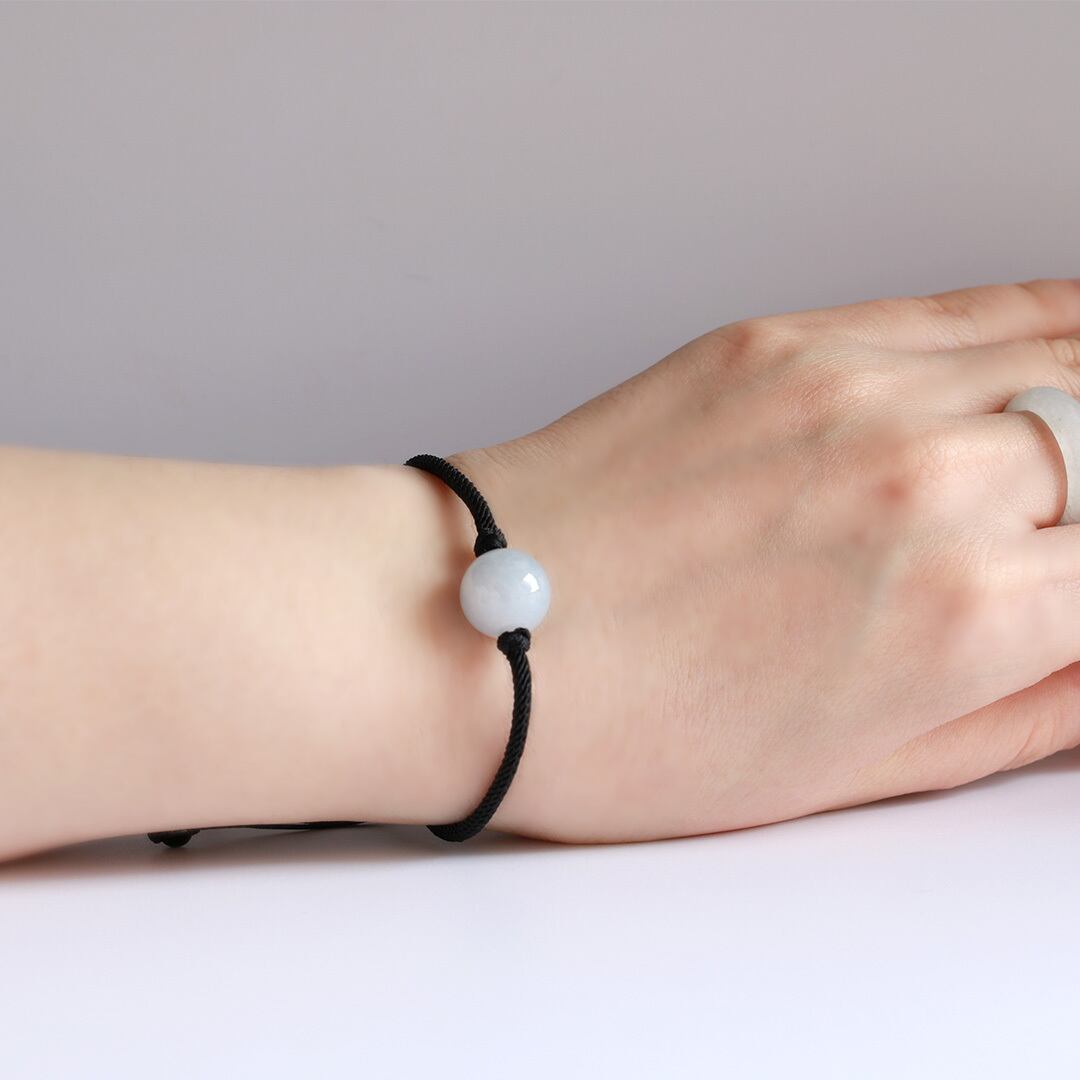 丈夫なシルクの蝋引きの紐に大粒の翡翠を1粒あしらうことで、カジュアルだけど、存在感のあるブレスレットに仕上げました。