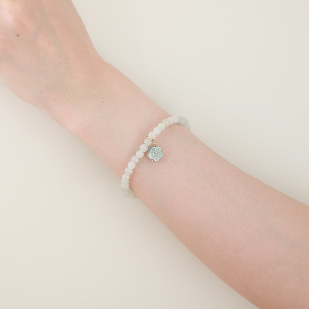 翡翠のゴムブレスに合わせて雰囲気を変えてコーディネートしたり