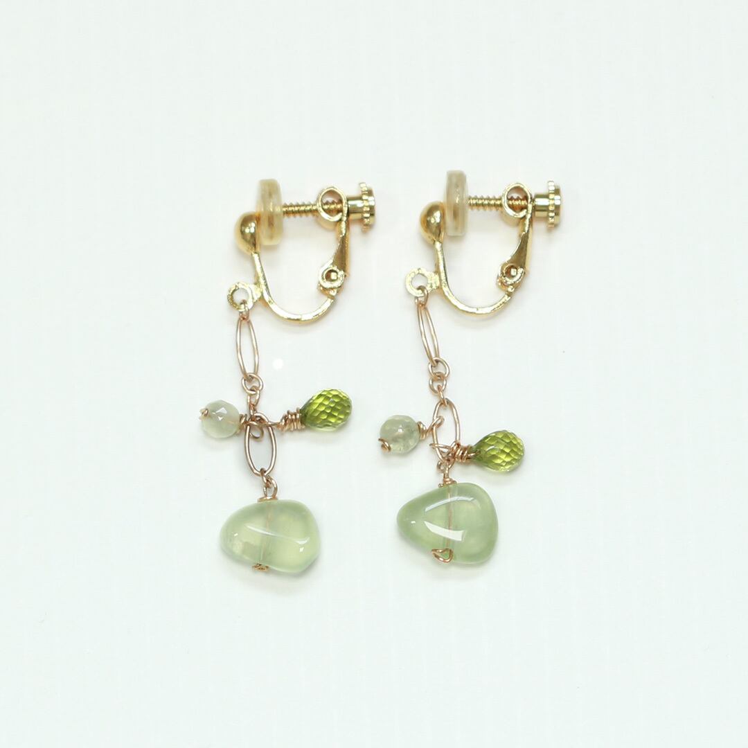 このピアスには、プレナイトとペリドットの美しい石が使用されています。