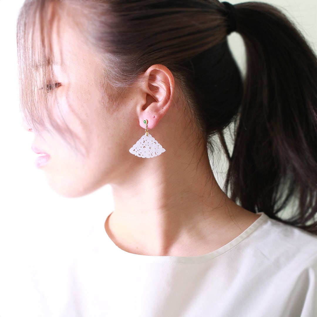 艶のある白翡翠と透き通る緑の翡翠のMeiNuオリジナルピアスのご紹介です。